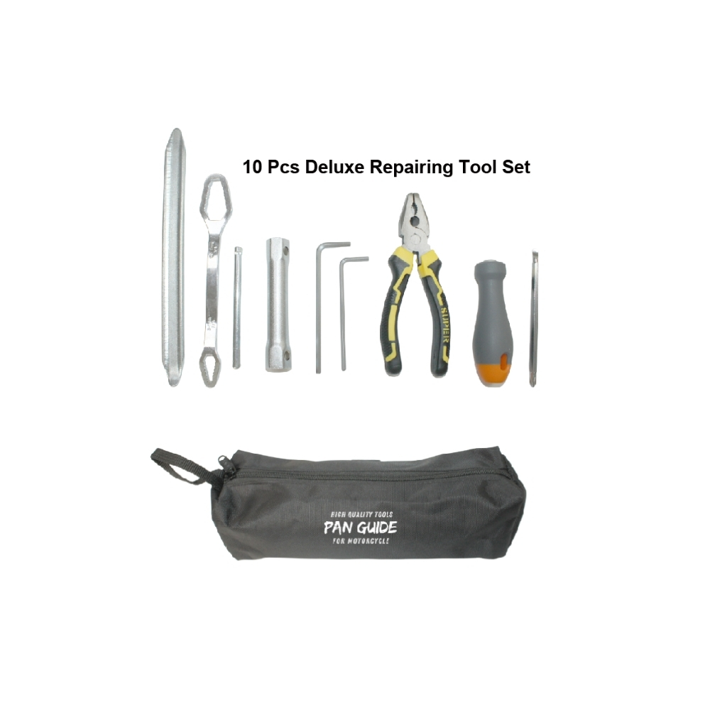 The MT005 - 2010 - 02 10 - piece deluxe repairing tool set combines various practical tools such as tire irons, multifunctional wrenches, and spark plug wrenches. Matched with a portable tool bag, it provides comprehensive tool support for scenarios such as home repair and motorcycle maintenance, helping to complete repair work easily and efficiently.