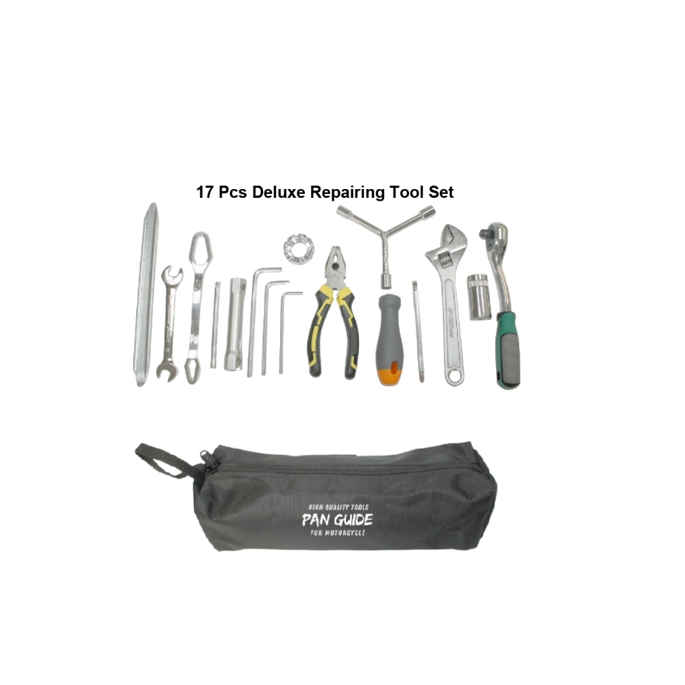 The MT005 - 2017 - 05 17 - piece deluxe repairing tool set combines various practical tools such as tire irons, multifunctional wrenches, spark plug wrenches, and bicycle spoke wrenches. Matched with a portable tool bag, it provides comprehensive tool support for scenarios such as home repair, bicycle maintenance, and motorcycle maintenance, making various repair tasks easy to carry out.