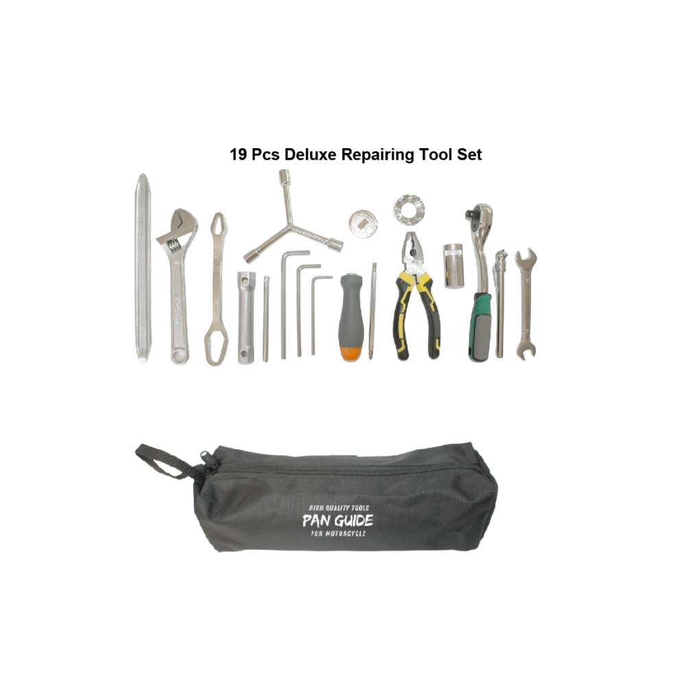 The MT005 - 2019 - 06 19 - piece deluxe repairing tool set combines various practical tools such as tire irons, adjustable wrenches, multifunctional wrenches, spark plug wrenches, and bicycle spoke wrenches. Matched with a portable tool bag, it provides comprehensive and professional tool support for scenarios such as home repair, in - depth bicycle maintenance, and fine motorcycle maintenance, helping to easily deal with various complex repair tasks.