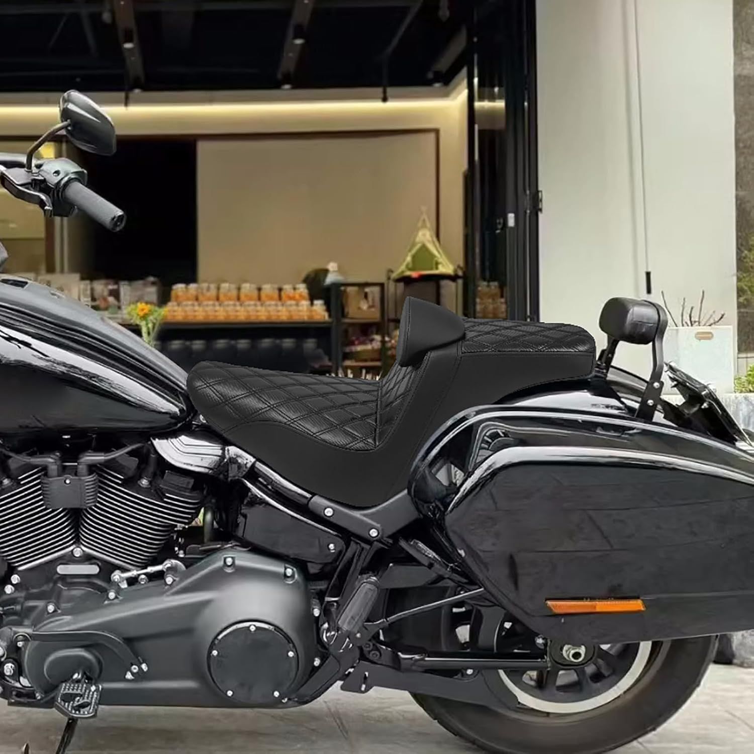 One-piece two-up design incorporates rider seat and pillion: Take your custom style up a notch. This one-piece two-up seat features premium smooth black vinyl with a stitched-in a diamond Stitch pattern on the rider and passenger seating surface, adds a touch of elegance and enhances grip for both rider and passenger