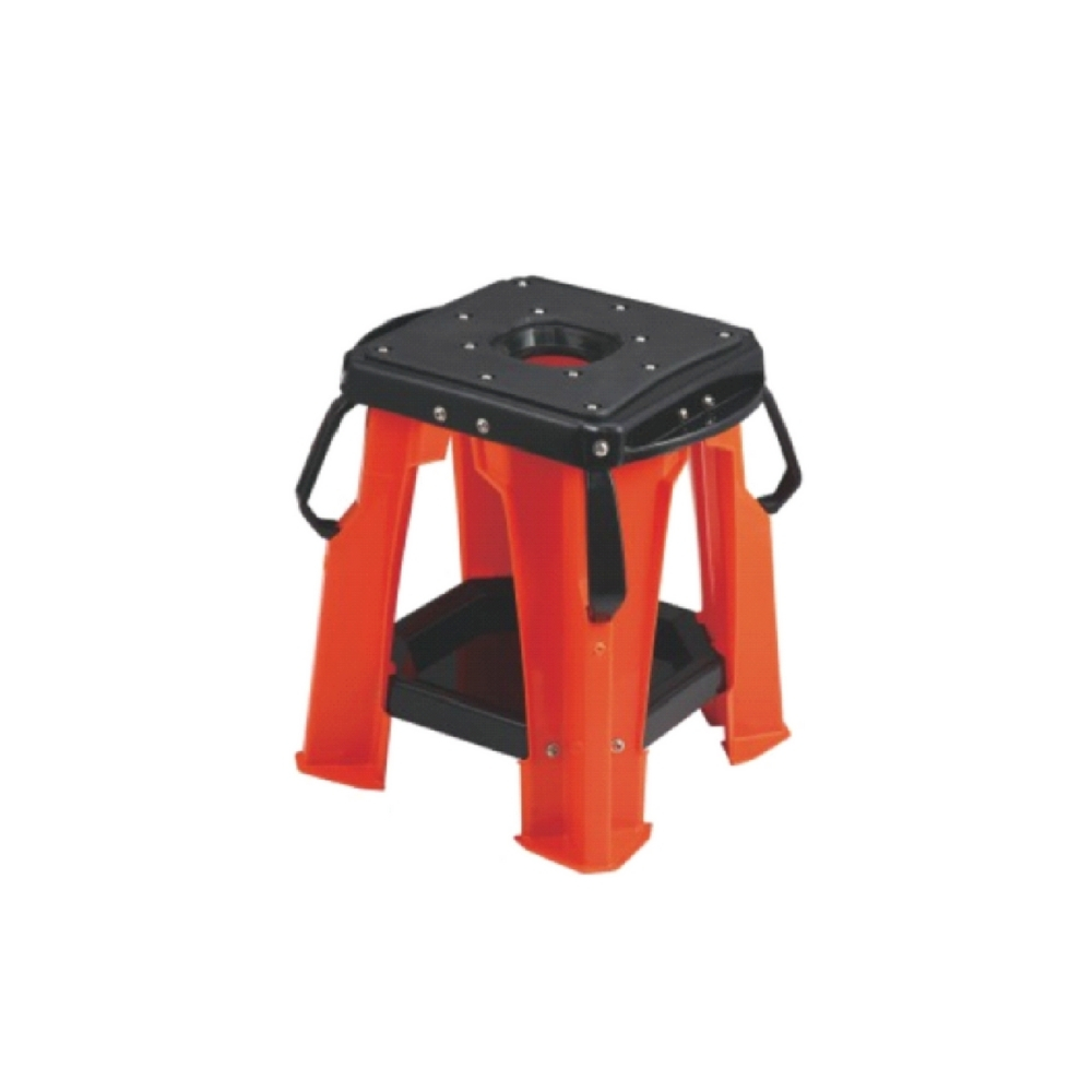 The MC61-JM002-BS001 bike stand is made of plastic, which is lightweight and durable. It comes in a variety of colors such as red, orange, and blue. With a universal design, it is suitable for various motorcycles.