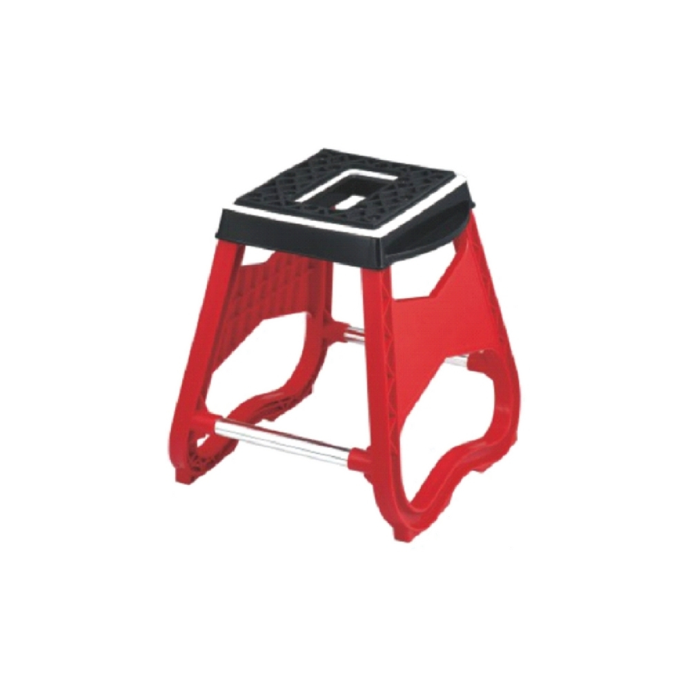 The MC61-JM002-BS002 bike stand combines plastic and aluminum materials, being both lightweight and sturdy. It comes in a variety of colors like red, orange, and blue. With a universal design, it suits various motorcycles.